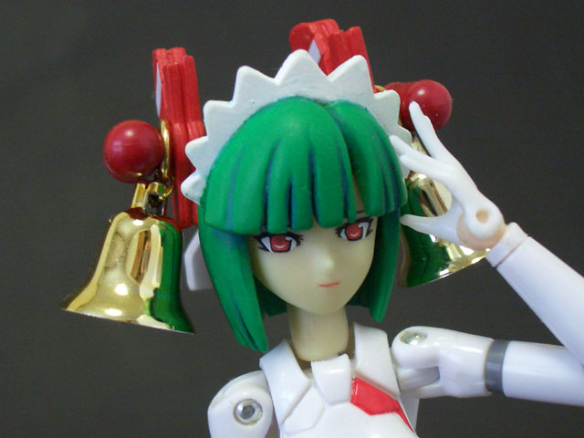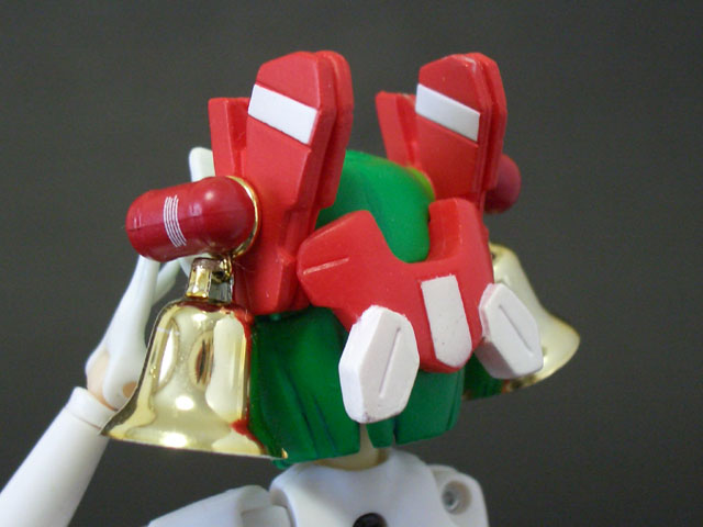 また、ツインテールよりノーマルおかっぱの方が好みだったので、替わりにハンズで買ったクリスマス用の装飾ベル(プラ製金メッキ)を、同じくハンズで買った金具に通し、建子さんに付属のタンクパーツで留めています。