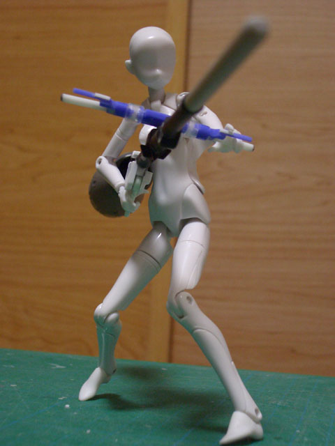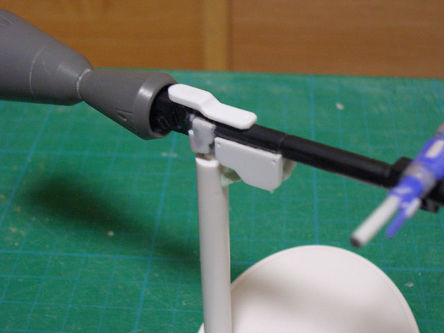 神姫共通規格の孔があるので、写真のようにスタンドに接続したり、他の武装のピンに接続する事もできます。